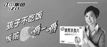 需要补充说明的是,此时的江中健胃消食片,横跨成人、儿童助消化药两个市场。由于这两个市场在消费者、竞争者各方面,均存在一定的差异,对成人而言,江中健胃消食片主要解决“胃胀、腹胀”的问题,而对于儿童,则主要解决“孩子不吃饭”(儿童厌食)的问题,所以江中公司针对成人和儿童市场,分别进行不同的广告诉求,其中针对儿童市场的广告是“孩子不吃饭,请用江中牌健胃消食片”。不难看出宏济堂此次行动的用意——直接针对江中健胃消食片,细分其儿童市场。