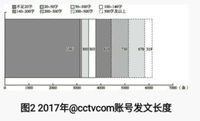 2.帖文报道以短小精悍内容为主,形式多样从帖文的报道内容字数来看,2017年CCTV在Facebook平台的发文内容以短小精悍的居多,其中不足20字的超过3000条,约占所有发文的1/2 (见图2)。短小精悍的文字写作符合社交媒体时代重视觉传播、轻文字传播的规律。精悍的文字配以精美的图片或小视频,有利于增加账号的关注度。