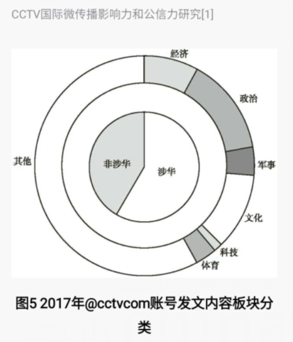 3.立足中国,报道议题配比合理从图4中CCTV在Facebook平台全年发文热词和图5@cctvcom账号发文内容板块分类可以看出,2017年,@cctvcom.发布帖文涉华内容依旧是主流。在所有帖文中,与中国相关的内容占据了近3/4,可见,CCTV的Facebook平台运营始终以中国自身为立足点,讲述中国的故事,传播中国的声音。从报道议题配比来看,@cctvcom报道议题具有多样性,涵盖经济、政治、文化、军事、科技、体育等各个方面。其中,其他类、政治类和文化类的新闻居多,其次是经济类新闻。