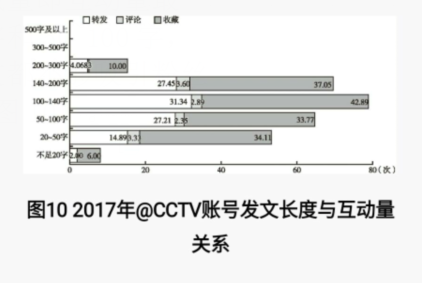 资料来源:中国日报社-中国科学院自动化研究所新媒体联合实验室"全球媒体云”平台。资料来源:中国日报社-中国科学院自动化研究所新媒体联合实验室"全球媒体云”平台。3.发文长度100~140字互动量最高与Facebook平台略有不同,Twitter 平台有着推文140个字符的限制。据统计,@CCTV账号推文字数在100~140字的转发、评论和收藏量即互动量最佳,其次是140~200字和50~100字,字数过多或过少的推文都不够吸引粉丝与账号之间的互动(见图10) 。