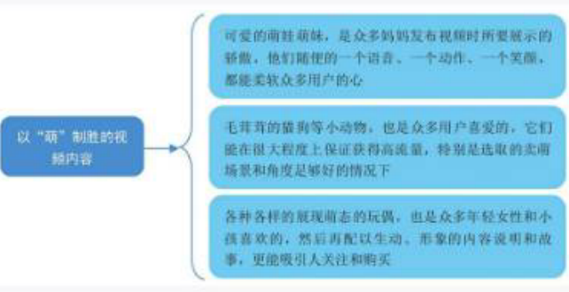 特别是在抖音平台上,以“萌”制胜的视频类型和内容有很多。总的说来,包括三种,如图所示。