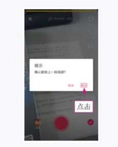 运营者每拍一段视频,都会在右下角出现和图标。如果运营者希望保留上一段视频,可以点击V图标;如果运营者希望删除上一段视频,可以点图标,然后在弹出的提示框中点击"确定”按钮,如图下图所示。