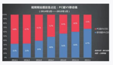 早在2015年,各家主流视频网站的年终报告上就已经写明网络视频向移动端变迁的速度极快,如图1-11所示。而时至今日,移动端视频播放量全面超越PC端是已经发生的事实(占比已超70%)。但移动端对PC端视频的播放侵蚀不会一直持续,最终会在某一个高点达到动态平衡。