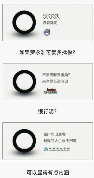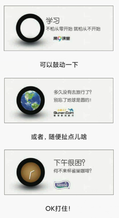 虽然看起来很神奇,但这只是一种技巧而已,一个圆圈关键看你怎么解读。比如第九课堂是一个跟学习和教育相关的网站,这个圆圈就要跟学习扯上关系。所以我觉得“不怕从零开始,只怕从不开始”这样的话是随口就来的。而问题的关键是,圆圈不代表任何含义,圆圈虽然简单,但简单有简单的好处,就是你可以随意解读它。如果你具体到了一个图,反倒是很难随意发挥了。那么,你看去哪儿网的那一篇,因为跟旅游有关系,所以你就想:旅游跟一个圆圈有啥关联的啊?地球是圆的嘛。猎聘网,它跟工作有关系,那就跟工资扯上呗,所以才有让你的工资加个零,其实这种文案很好写啦!