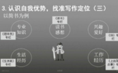 如果你对自己的优势不清楚,该怎么办呢?那就要画另一张图了。这张图由5个圈组成。聪明的你一看就懂了,原来可以从这5个方面去寻找自己的优势啊。对!专业知识、生活经历、兴趣爱好、工作经历、读书感想,总有一款适合你。