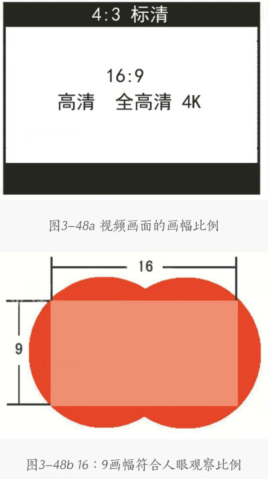 目前主流的摄像机和视频画面根据像素的多少分为标清、高清和全高清。同时高清指标与摄像机的画幅比例又是相对应的,而画幅比例对人的视觉感受也有影响。标清基本上是4︰3的画幅比例,如有特殊需要可以在4︰3的画幅上下打上掩膜显示出宽幅的比例,而高清和全高清都是16︰9的比例(图3-48a),与人眼的视觉范围相近(图3-48b),也符合宽荧幕的特点。最新的4K影像则是更大的长宽比例。