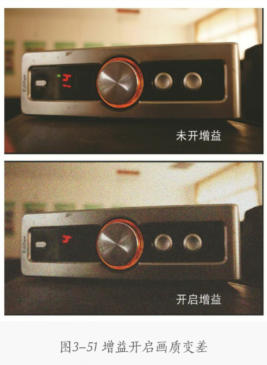 要注意,提高增益能够在光线不好时摄像,但同时也有使画面质量明显下降的弊病。一般情况下不要随意开增益,应尽量通过开大光圈等手段来增强进光量,以保证画面质量。如果需要使用增益,首先选用低(L)挡,尽量避免使用(H)高增益。当增益开到高(H)挡时,画面会出现如雪花般的噪点,画面清晰度会下降,色彩饱和度和反差都会变差(图3-51)。高增益只有在一些特别紧急的情况下,抓拍重要画面时才使用。
