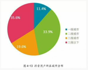 抖音用户中,一线城市用户占比为11.4%,二线城市占比为33.9%,三四线城市用户占比为54.7%。这个比例说明,抖音平台上一二线城市用户和三四线城市用户比例相当,用户的地域覆盖面比较广。