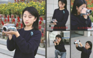 小型家用摄像机(掌中宝)体积小巧,握持方式比较灵活。通常以右手为主拍摄。站立时右手持机,左手握住液晶屏或托住镜头来稳定摄像。高角度拍摄可以单手举高摄像机、向下翻转液晶屏进行拍摄;也可以放在腰部低角度向上,右手翻转液晶屏取景,左手托住摄像机拍摄。具体握持姿势参考如下图。