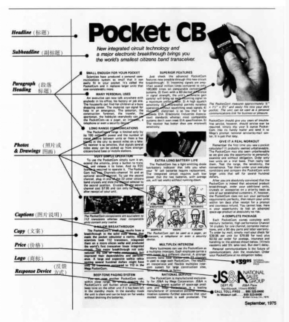 为了引出这个概念,让我们先看一则民用波段收音机的广告,它从1975年投放到1977年。这则广告拥有你希望从空间广告上看到的所有要素。为了更好地了解这条公理,我让我的学生们给广告10个元素的作用都下了清楚的定义。下面就是我们一致认可的: