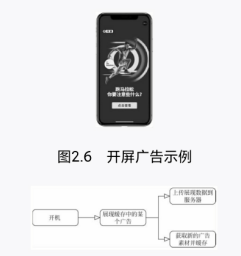 开屏广告最早起源于苹果的Launch Screen,设计之初主要是为了更好的用户体验。在启动应用的时候,Launch Screen能快速替换掉应用的第一个屏幕,从而给用户一种应用运行流畅的感觉,当时官方还强调了不要用于广告。但无论是开屏的时间点,还是Launch Screen的全屏展现效果都非常适合投放广告,所以国内大多数应用都做了开屏广告,图2.6是其中一个例子,这是一个不可避免的趋势。一般来说,开屏广告按照图2.7所示的流程工作,开机的时候随机展现缓存中提前缓存下来的广告内容,当用户打开应用时,再同步获取新的广告物料信息到缓存。这种广告一般按天售卖,且卖的价格比较高,有些应用还支持按地域定向投放。