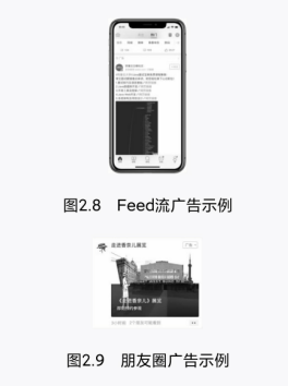 微信朋友圈广告也是一种Feed流广告,它以类似朋友原创内容的形式在朋友圈中展现,用户可以通过点赞、评论等方式和广告互动,广告内容也和普通的朋友圈内容一样。区别于其他类型的Feed流广告,用户只能看到朋友和广告之间的互动,具有很强的引导性,朋友的互动更容易引起基于社交关系的传播,带来除了单纯曝光效果外的社交加成效应。图2.9是朋友圈广告的一个示例。