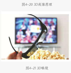 3d立体影像技术是根据左右眼双影像合成立体影像的原理(图4-19),使用3D摄像机双镜头来拍摄画面(图4-20),在摄像机中进行处理得到双重影像素材,得到的影像素材经过3D剪辑机编辑后,在3D电视上播放。这样的画面会在屏幕上形成重影,需要佩戴特殊的3D眼镜观看(图4-21),使重影合二为一,从而感觉到立体的效果。