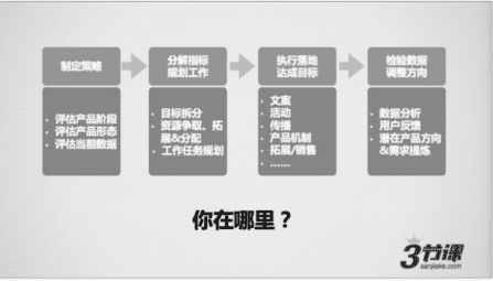 第四,监测数据、调整方向。所有计划执行后,作为一个合格的运营,我们一定要学会收集数据,分析数据和相关用户反馈,并评估我们的运营工作成效,再根据数据和用户反馈寻找潜在问题、潜在产品方向和用户需求等,并将结论代入我们新一轮的运营工作中去,回到第一步:制定新的运营策略,进入下一个循环。