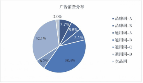 以通用词-D计划为例,分析该推广计划下全部关键词的广告消费和流量分布,如表4-7所示。我们选取了相同统计周期内广告消费TOP 5的关键词的广告消费占比及转化量占比。可以看到,TOP 5关键词消耗了该推广计划88%的广告预算,贡献了82.4%的转化量,应作为效果优化的重点关注。