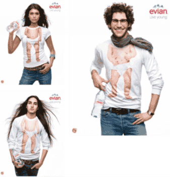 欣赏分析:看到这组广告,多会产生模特的头部和T恤衫上贝贝身体连接起来的错觉。该广告采用了风趣幽默和夸张的表现手法,传递出产品广告的主题:依云矿泉水,越喝越年轻。