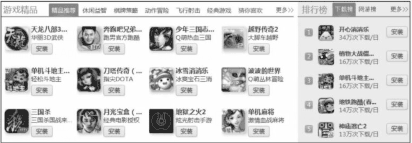 (2)游戏联运。游戏联运根据用户的最终游戏内消费在推广渠道和游戏开发商之间分成的商业产品,这仍然是一种按效果付费的泛广告产品。在页游和手游的推广中,联运是一种非常常见的发行模式,读者在各种产品中看到的图1-11所示的游戏下载专区,其背后的商业模式往往都是联运。实际上,在中国的各大Android应用市场中,游戏联运的收入远远超过其他类型的广告收入。如果将联运收入也算在广告收入中的话,互联网总体收入的广告占比还会提高不少。不同的联运渠道分成比例可能相差很大,经过我们调研,在Apple Store这样典型的国外市场中,渠道的分成比例一般为30%,但是在中国,有些强势的联运渠道分成比例甚至可以达到90%以上。游戏联运也完全可以按照广告产品思路来设计和运营,另外其广告库同样具有易于原生化的特点。