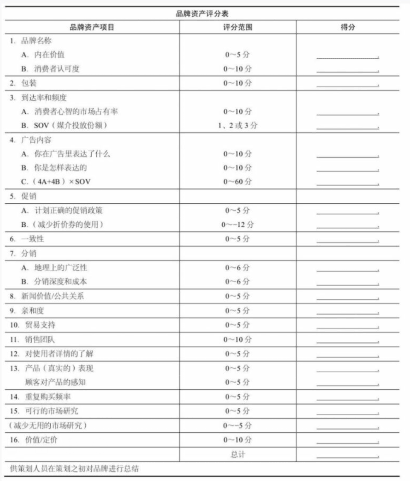 (5)促销:有设计的促销能够增加品牌资产,盲目的折价促销只会损害品牌资产。过去12个月中每用过1次折价券促销,就减去1分。