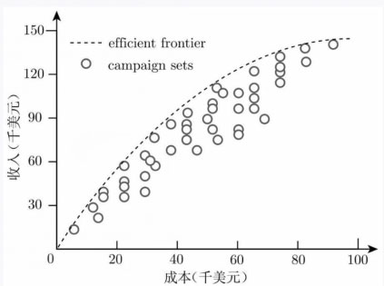 如果将搜索广告里的标的物,即关键词,类比于股票,那么在一定预算的限制下分配各个关键词上的投入以求达到整体ROI的最优,从框架上看非常类似于上述的投资组合问题。因此,EF公司按照这一思路,将量化金融里的投资组合理论与计算广告技术结合起来,创造性地发展出了大规模的关键词出价优化技术。图5-11中给出了efficient frontier的一个示例,图中每个点代表一个广告投放设置,即关键词组合及其出价,而每一个组合也就对应了一个收入和成本。将各成本对应的最高收入的投放设置连接起来,就构成了efficient frontier曲线。找到这条efficient ffrontier曲线后,给定广告主的预算,就可以找到最佳的投放策略。在可选的关键词数量很大时,投放设置的集合规模非常大,再加上搜索引擎非实时的数据反馈,可以想见此优化问题的困难程度。