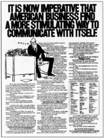 创作这则广告的广告公司可能认为他们有一个聪明的点子。他们的理念是通过对比体现传统通信方式的乏味和视频化新方式的刺激性(这则广告最早出现在20世纪70年代中期)。